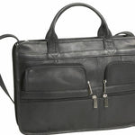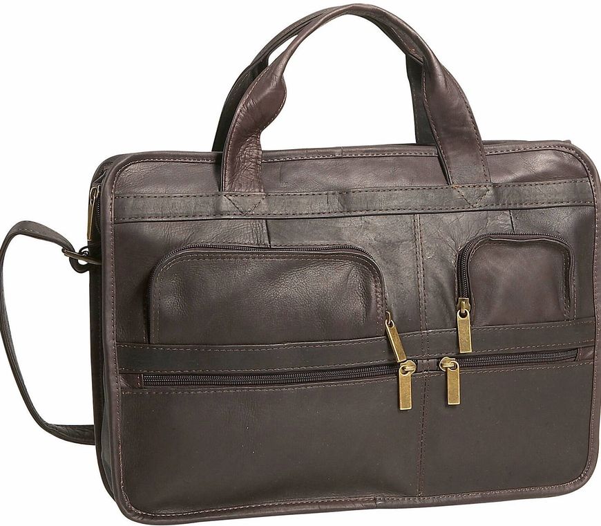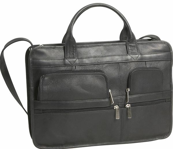 A modern classic with u-shaped, zippered front pockets for agenda, cell phone or computer accessories. Two smaller front zippered pockets are great for keys, ID or personal business card holder. The large main compartment can accept a notebook computer if you have a padded insert for it, or it will hold several thick files and paperwork. Rear zippered pocket for loose paperwork. An integrated organizer section includes a calculator pocket, card pocket and pen/pencil pocket. Adjustable, removable shoulder strap.